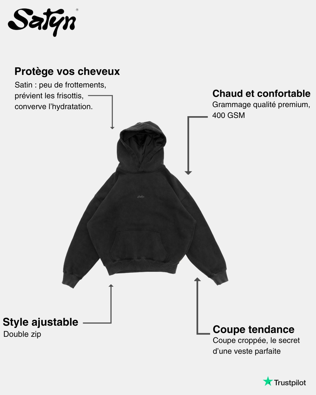 Der Satyn-Kapuzenpullover mit Reißverschluss vereint Komfort, Stil und Haarpflege perfekt. Entwickelt, um Ihnen im Winter ideale Wärme zu bieten und gleichzeitig Ihr Haar zu pflegen, verfügt es über eine mit Satin gefütterte Kapuze, die die Feuchtigkeit Ihres Haares bewahrt und vor Frizz schützt. Mit seinem übergroßen Schnitt und der hochwertigen Verarbeitung ist dieser Kapuzenpullover ein Muss für einen modernen Look und optimalen Schutz.