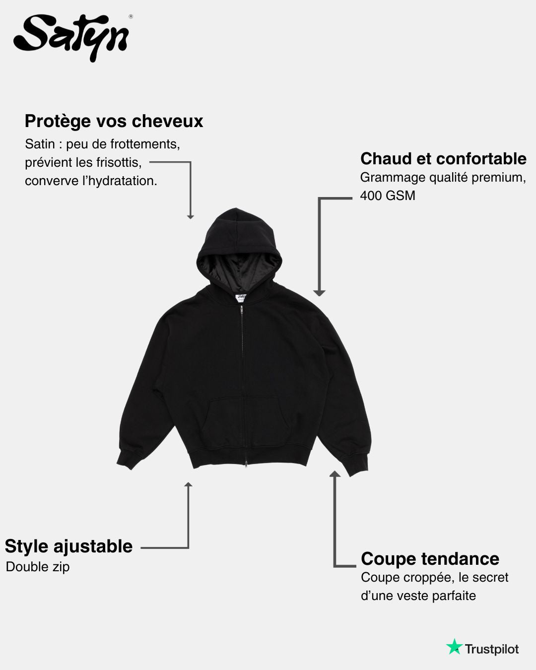 Der Satyn-Kapuzenpullover mit Reißverschluss vereint Komfort, Stil und Haarpflege perfekt. Entwickelt, um Ihnen im Winter ideale Wärme zu bieten und gleichzeitig Ihr Haar zu pflegen, verfügt es über eine mit Satin gefütterte Kapuze, die die Feuchtigkeit Ihres Haares bewahrt und vor Frizz schützt. Mit seinem übergroßen Schnitt und der hochwertigen Verarbeitung ist dieser Kapuzenpullover ein Muss für einen modernen Look und optimalen Schutz.