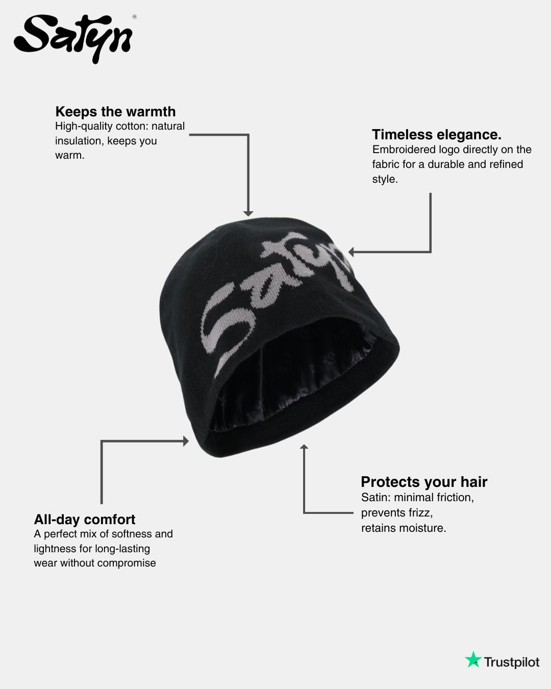 Verzorg je haar nu op stijlvolle wijze met onze Satyn pet, het onmisbare accessoire om moderne stijl en haarverzorging te combineren! Deze muts is ontworpen voor streetwearliefhebbers en voor iedereen die op zoek is naar functionaliteit zonder in te leveren op uiterlijk. Onze hoed is een perfecte balans tussen esthetiek en welzijn.